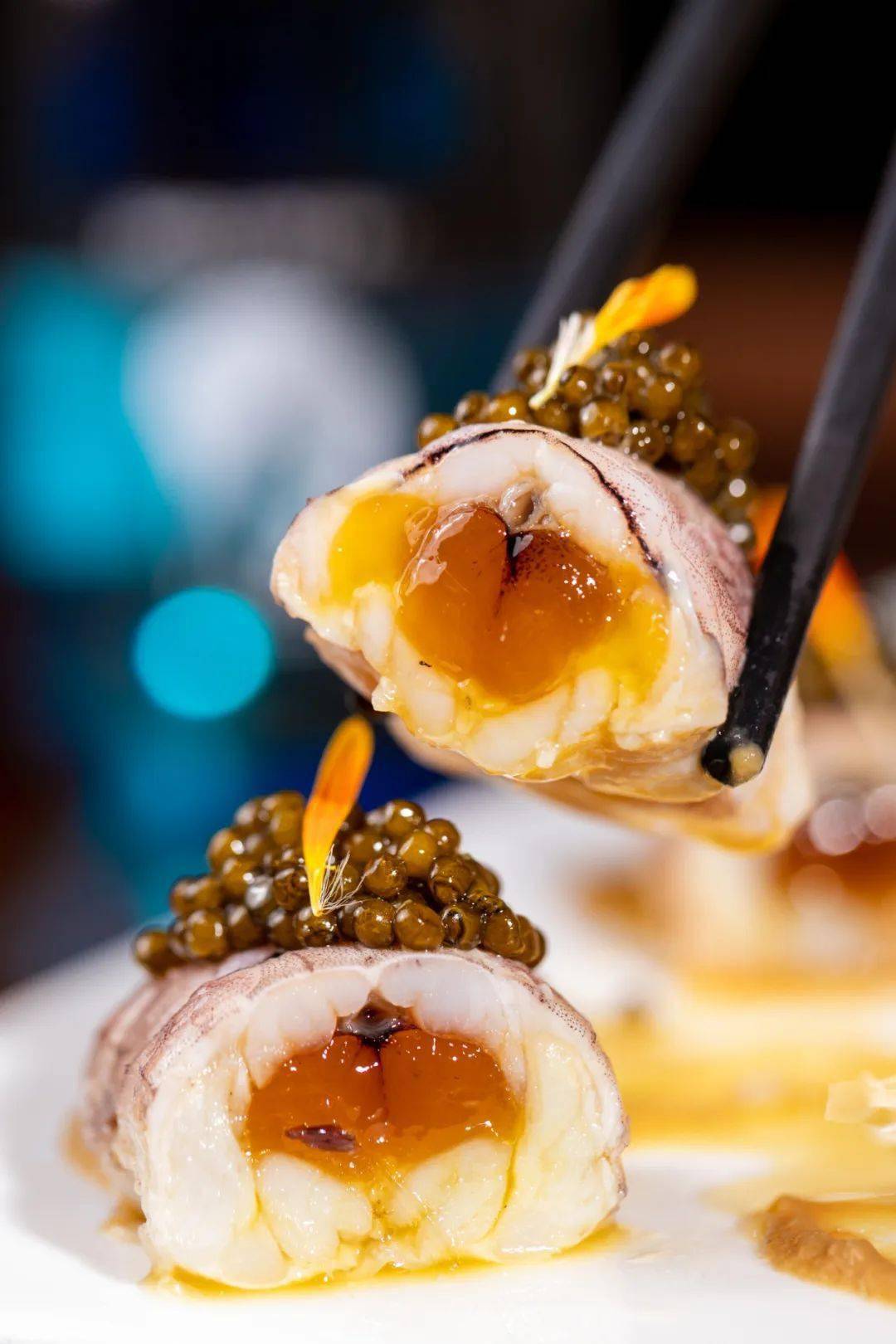 富贵虾要经历冰火两重天的考验,鲜味被完全锁住,看这如琥珀般金黄色诱人的虾膏,连着鱼子酱一口吃下,溏心在舌尖融化,鱼子酱带着咸鲜颗颗爆裂,难怪有人说它是潮汕打冷的巅峰之作。