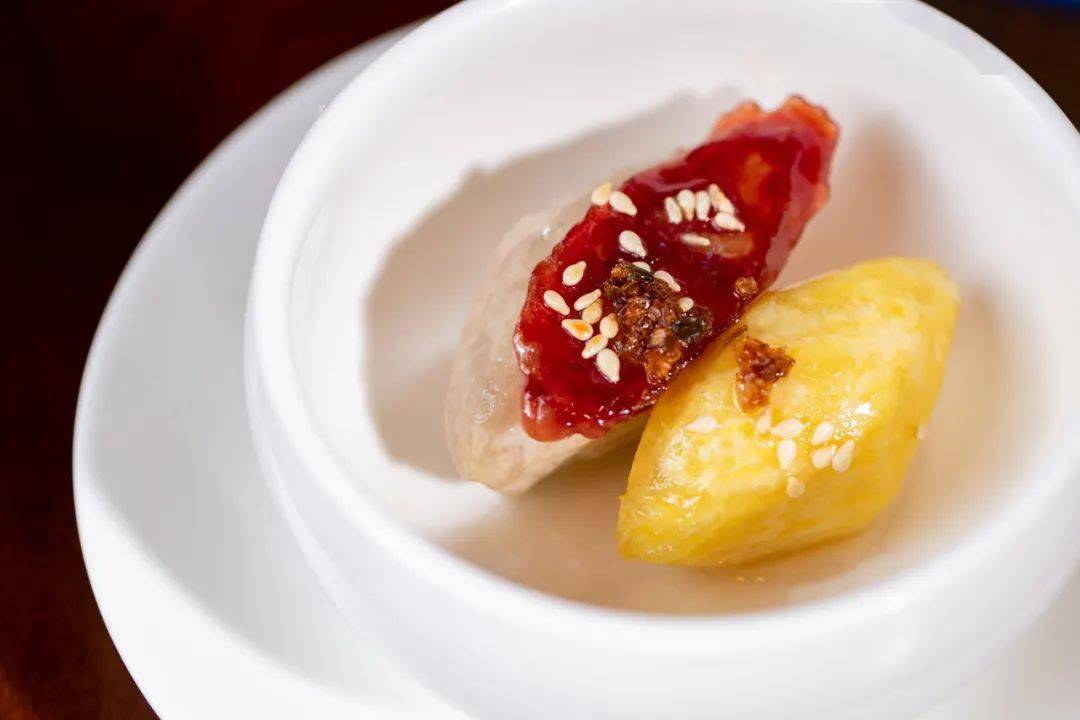 容腊用的是西班牙伊比利亚的猪肉自然生晒,有特别的香味和完美的油脂,再加上潮汕传统做法的炣烧广西荔浦芋头、海南番薯,粉糯香甜,又甜而不腻,爆碳也要吃完!