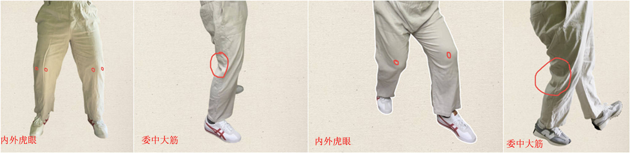 第一、膝盖要有四面劲。《纳卦经》中讲:“凡一用步,两外虎眼极力向内,两内虎眼极力向外,委中大筋竭力要直,两盖骨复竭力要曲。”,这就是膝盖的四面劲。其中内外虎眼是我们膝盖骨两侧的凹陷处,外面的叫外虎眼,里面的叫内虎眼。练习桩步的时候,两内虎眼往外用力,两外虎眼往里用力,这样内外就会形成一种稳定的对挣力。同时膝盖向下微微弯曲,膝盖后面的委中大筋又竭力拔直。如何拔起委中大筋,以前已经详细讲过了,大家可以参看我的文章《站桩和练拳时如何拔起委中大筋?》,这种上下挣力就像我们被人往下按,但自己极力要站起来一样,委中大筋自然会膨起。此时内外之力与上下之力交合,膝盖就可以做到四面劲了,下盘也可以达到稳固有力。但这样只是第一步,这时练的是下肢的局部力,桩步虽然可以做到稳固但移动不灵活。练习桩步最终还要把下肢的劲力与身体的劲力贯通才能练出稳固有力的下盘和灵活的步法。接下来该如何练呢?