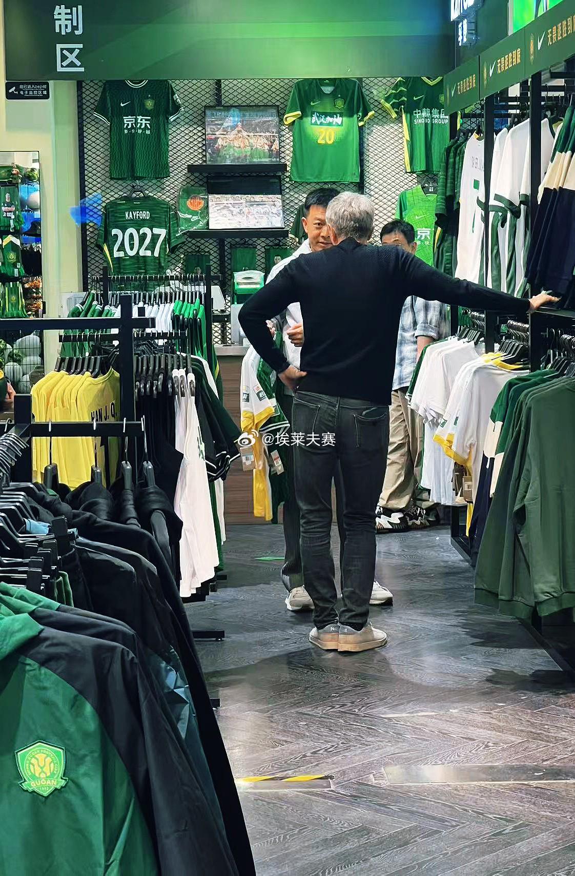 北京时间4月24日,据博主“埃莱夫赛”分享的照片显示,国安主帅塞蒂恩携翻译付豪造访了国安周边店。