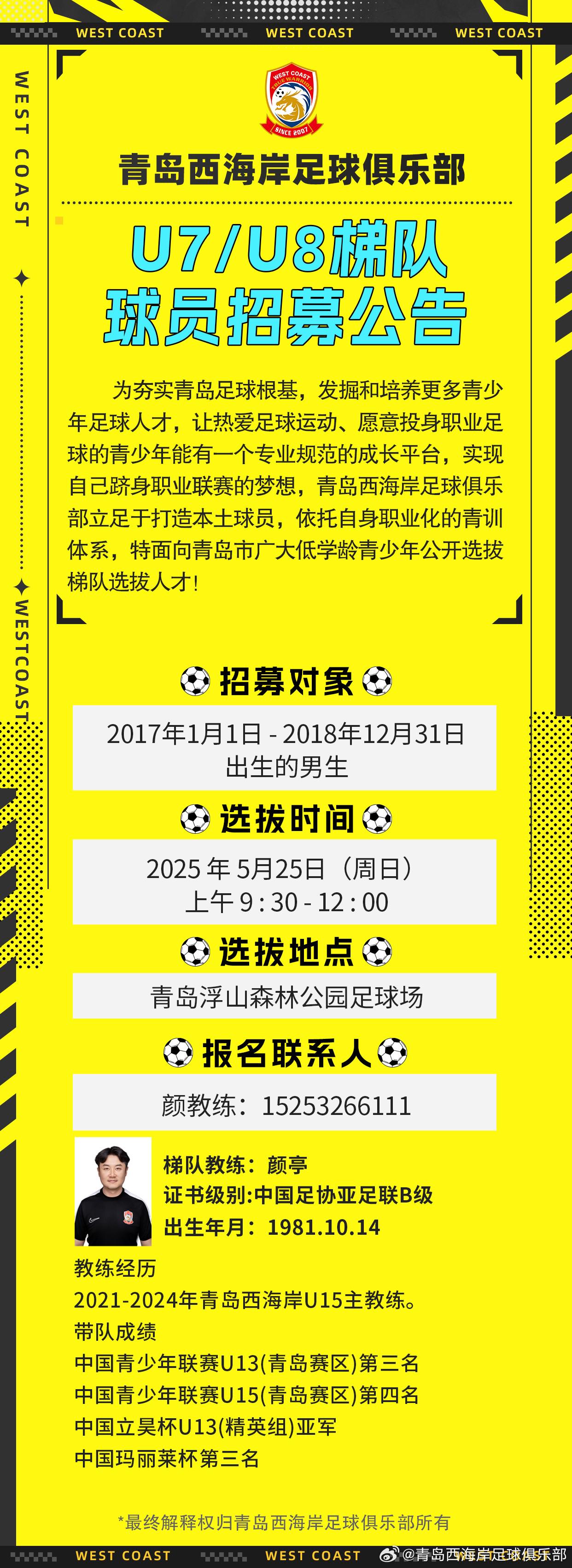 北京时间4月24日,青岛西海岸足球俱乐部招募U7/U8梯队小球员,面向青岛市公开选拔。