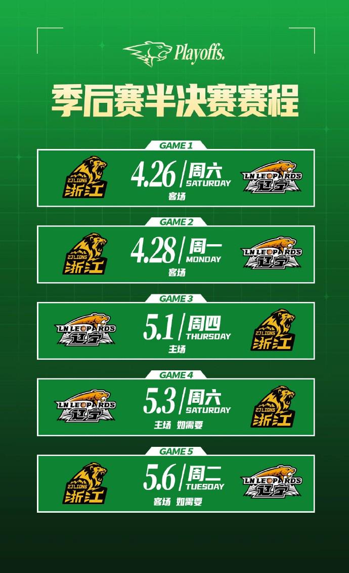 辽宁男篮将会在4月26日率先在客场对阵半决赛对手广厦男篮,后者是本赛季常规赛第一,拥有着所有系列赛的主场优势。5月1日,辽宁男篮将在主场迎来系列赛G3的较量。半决赛为5局3胜制,理论上G3这场比赛可能会决出晋级决赛的球队。