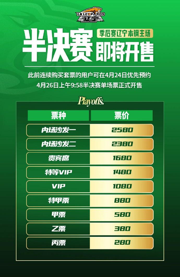 北京时间今日,辽宁男篮官方公布了辽篮半决赛主场门票发售方案,门票将于4月26日09:58公开发售,票价最高2580元,最低280元。