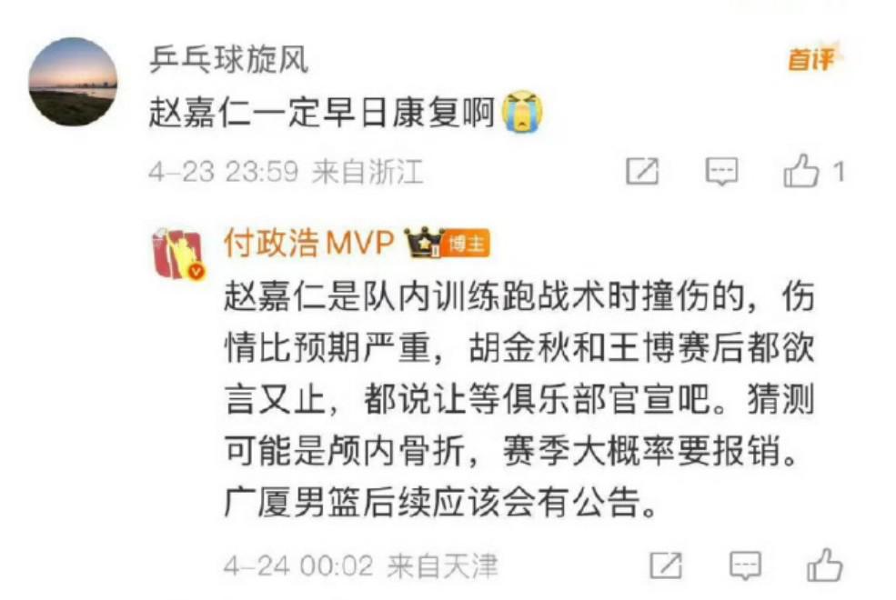 付政浩:“赵嘉仁是队内训练跑战术时撞伤的,伤情比预期严重,胡金秋和王博赛后都欲言又止,都说让等俱乐部官宣。猜测可能是颅内骨折,赛季大概率要报销。广厦男篮后续应该会有公告。”