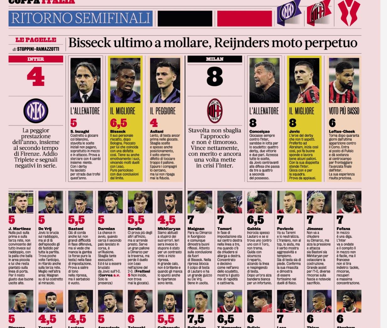 北京时间4月24日,在意大利杯半决赛次回合国际米兰0-3不敌AC米兰,总比分1-4被淘汰之后,《米兰体育报》对两支球队的表现进行了评分,其中约维奇8分最高,阿斯拉尼4分最差。