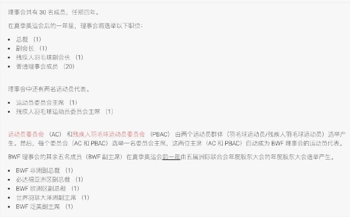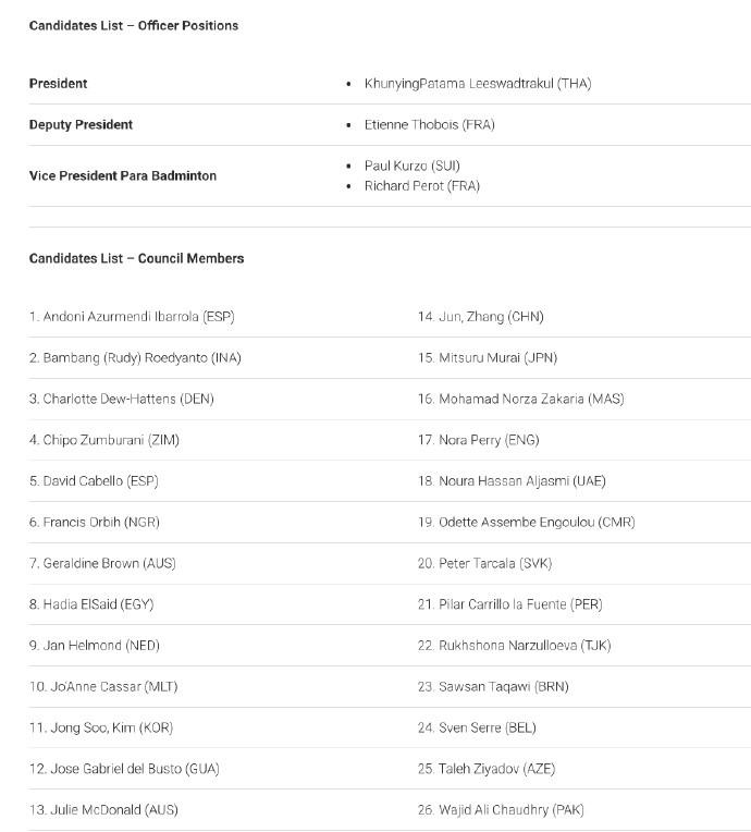 根据世界羽联章程,理事会共30名成员,普通理事会成员共有20位。将在4月26日世界羽联年度大会选举产生,任期为4年。