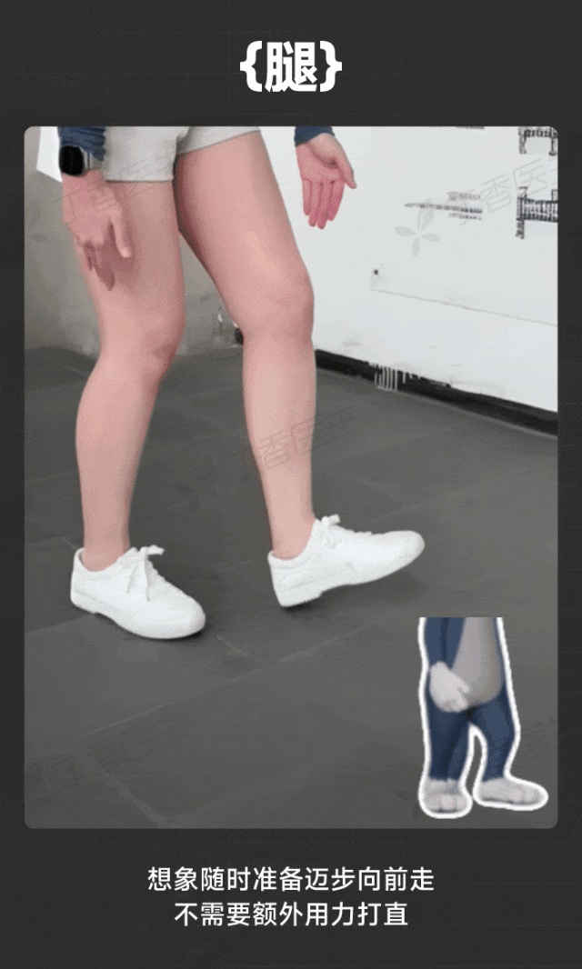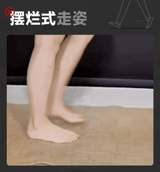再再比如:走路时候膝盖完全打直的「筷子式走姿」。