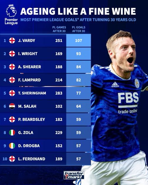 瓦尔迪确认将在本赛季结束后离开效力多年的莱斯特城,据统计,38岁的瓦尔迪是英超历史上30岁后进球最多的球员,一共打入107球。