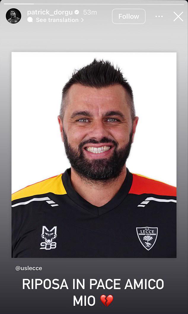 莱切队理疗师格拉齐亚诺-菲奥里塔于今日不幸去世,年仅38岁。曼联边后卫帕特里克-多古在社交媒体上发布了一张菲奥里塔的照片,并附上意大利语留言:“Riposa in pace amico mio”(安息吧,我的朋友)。
