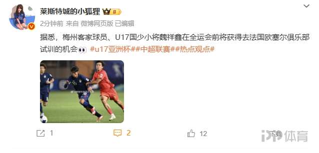 据博主莱斯特城的小狐狸透露,梅州客家球员、U17国少小将魏祥鑫在全运会前将获得去法国欧塞尔俱乐部试训的机会。
