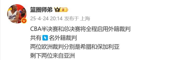 而根据目前的消息,CBA半决赛和总决赛将全程启用外籍裁判,这是让人欣慰的一件事情了。外籍裁判的分布是两个欧洲裁判,分别来自希腊和保加利亚。值得一提的是,欧洲裁判差不多就是与国际接轨的,他们对于细节的把控非常严格,就比如走步、打手等情况,这可能会让每支球队出现一些不适,当然他们赛前肯定也会进行一些针对性的研究。
