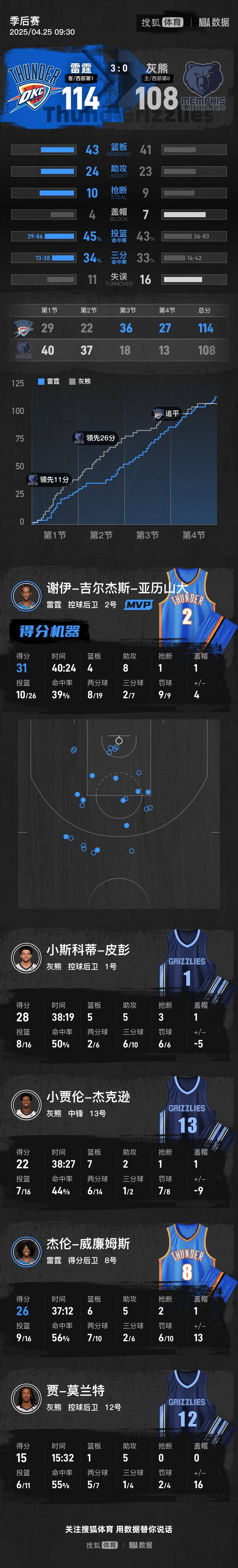 【搜狐体育战报】北京时间4月25日NBA季后赛,客场作战的雷霆完成大逆转,以114-108击败灰熊。系列赛3-0拿到赛点。