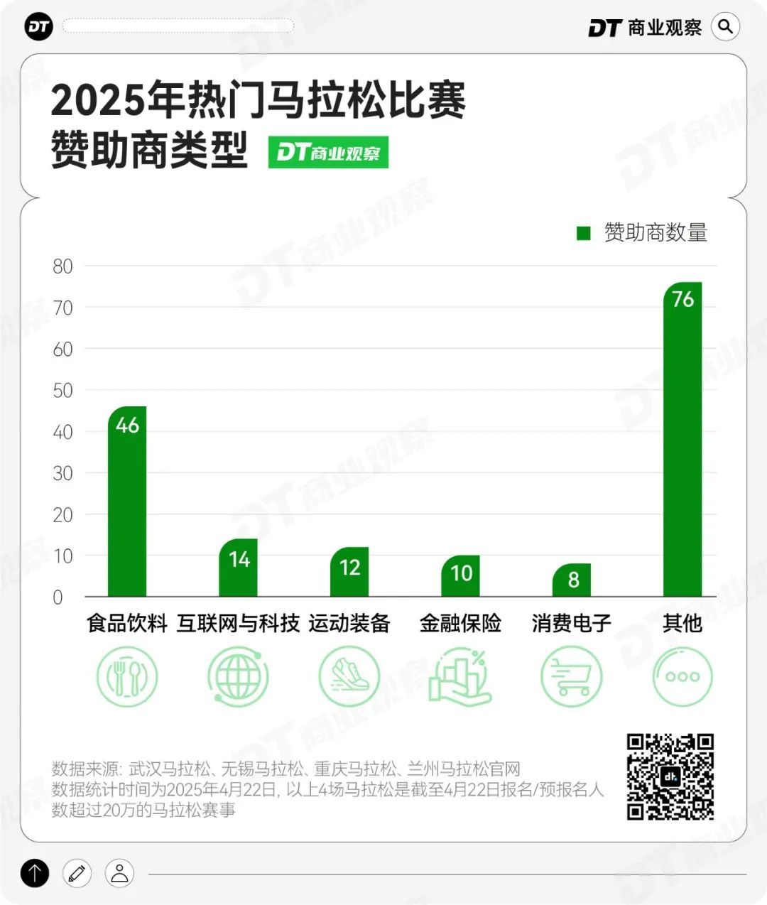 截至4月22日,今年国内以武汉马拉松、无锡马拉松、重庆马拉松、兰州马拉松为代表的多场马拉松比赛报名人数再创新高。我们统计了这4场报名人数超过20万的比赛赞助情况发现,食饮品牌、互联网与科技企业、运动装备品牌最爱和马拉松比赛合作。