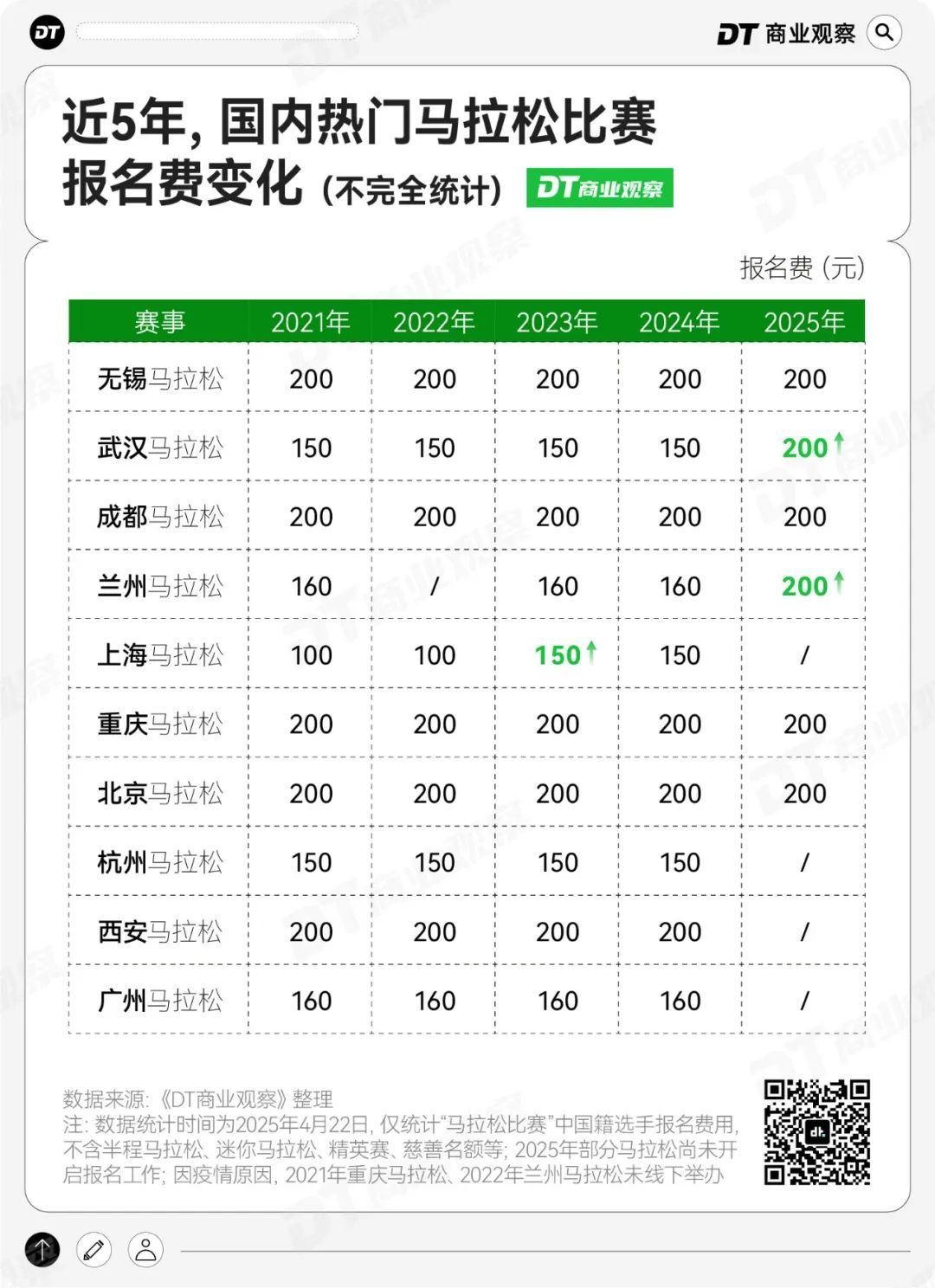 我们查看了目前国内报名人数较多的10场马拉松比赛的历年全马报名费,发现马拉松的报名费从以100-160元为主逐渐变成了以150-200元为主,2025年200元的报名费可能会成为“标配”。