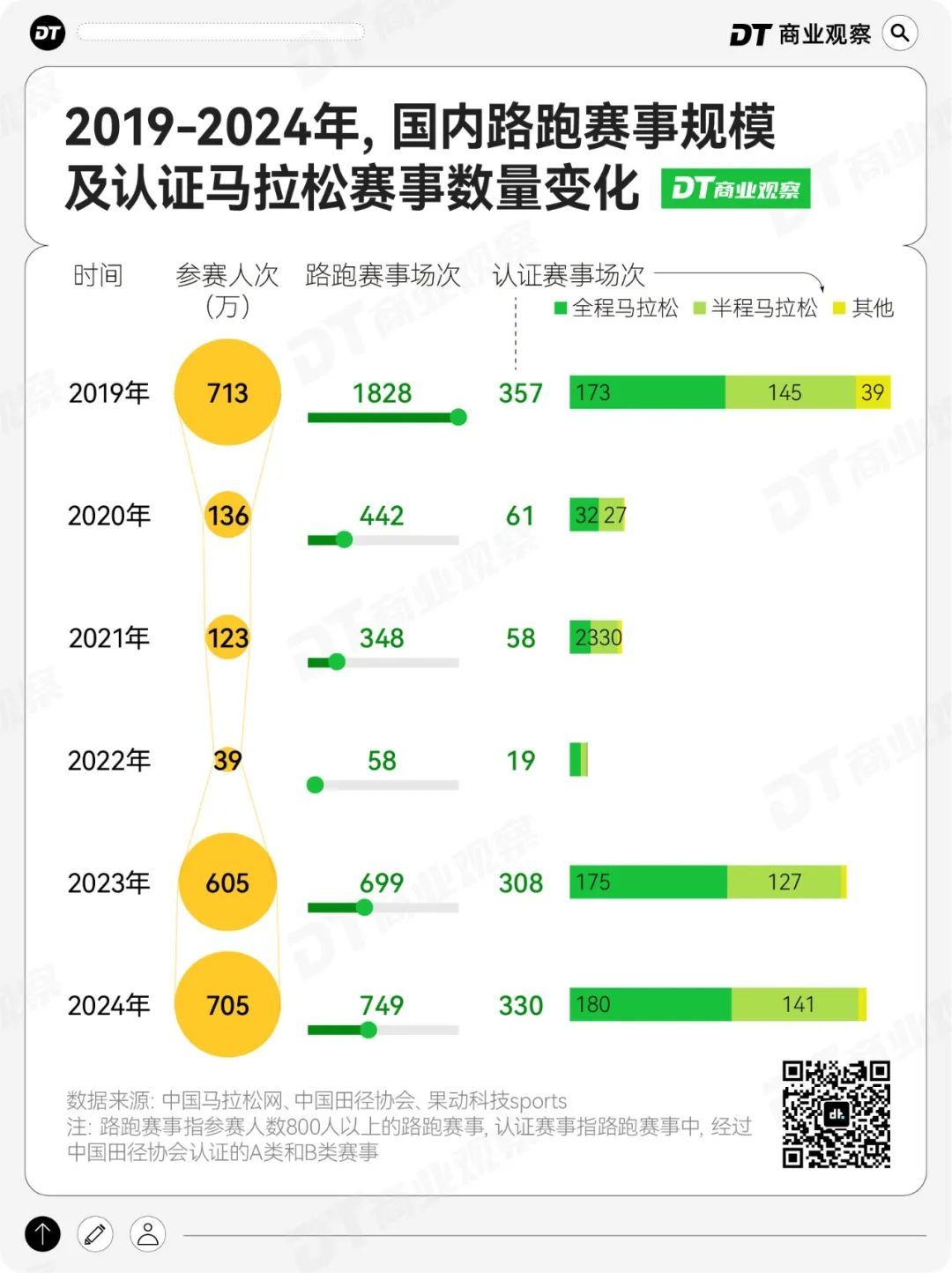 2024年路跑赛事共749场,累计参赛人数为705万人,其中认证马拉松赛事180场、认证半程马拉松141场,2019年全马和半马的认证赛事场次则分别为173场、145场。