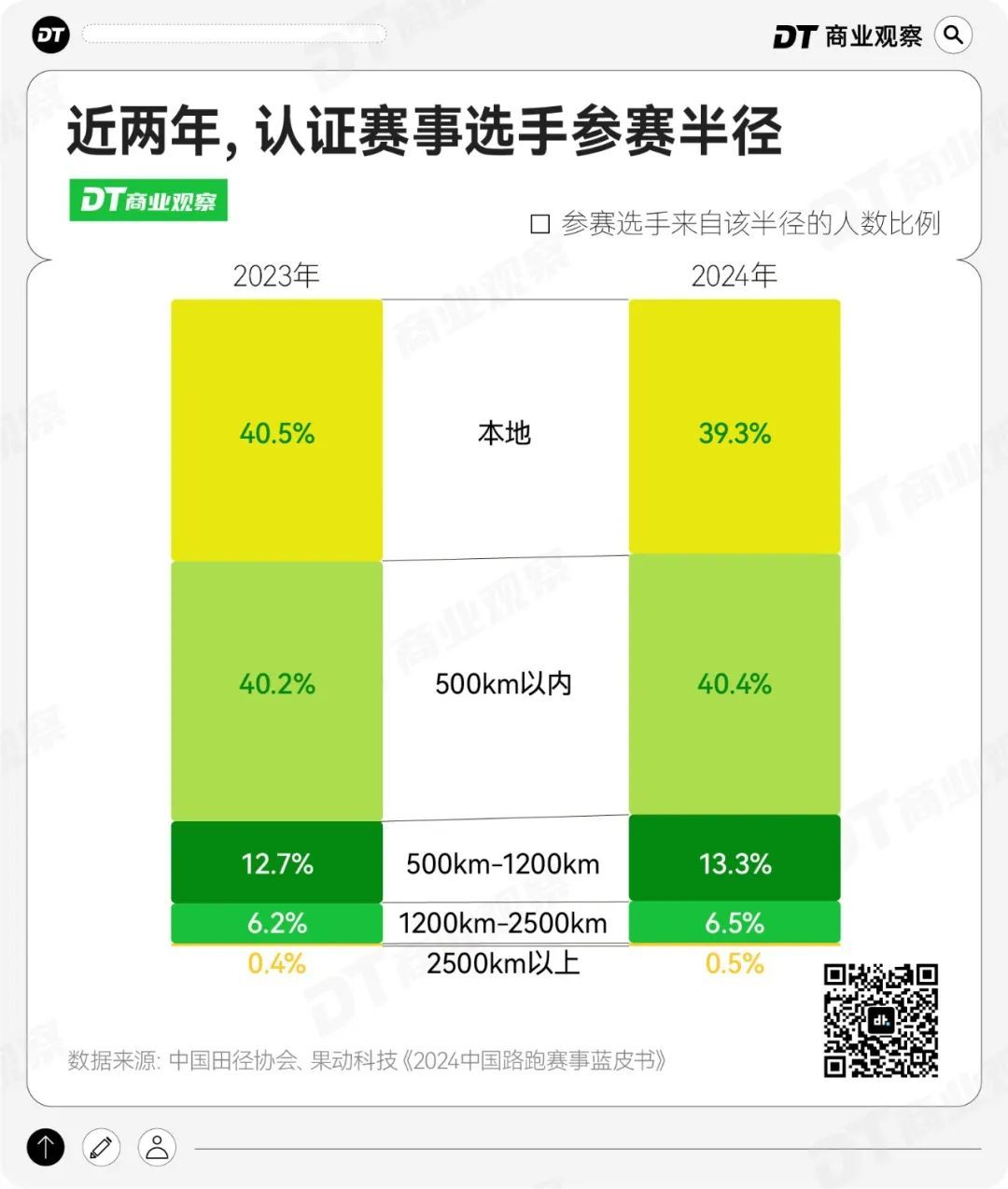 根据《2024中国路跑蓝皮书》,2024年认证赛事选手参赛半径,有60.68%都是非本地选手,且这个数据较2023年也有小幅提升(2023年为59.5%)——这意味着至少有一半以上跑友们需要为马拉松付出交通和酒店成本。