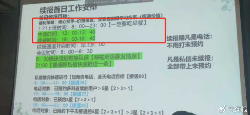 小达称,续报期间,他被要求每天打出至少50个电话,通话累计时长2个小时。“很多家长也不愿意沟通那么久。”而他们为了达到2个小时的通话时长,常常会加班打更多的电话来凑时长,再加上大多数员工都是兼顾销售和教学,还要抽时间完成录视频课、给学生讲题、回答家长的问题等。