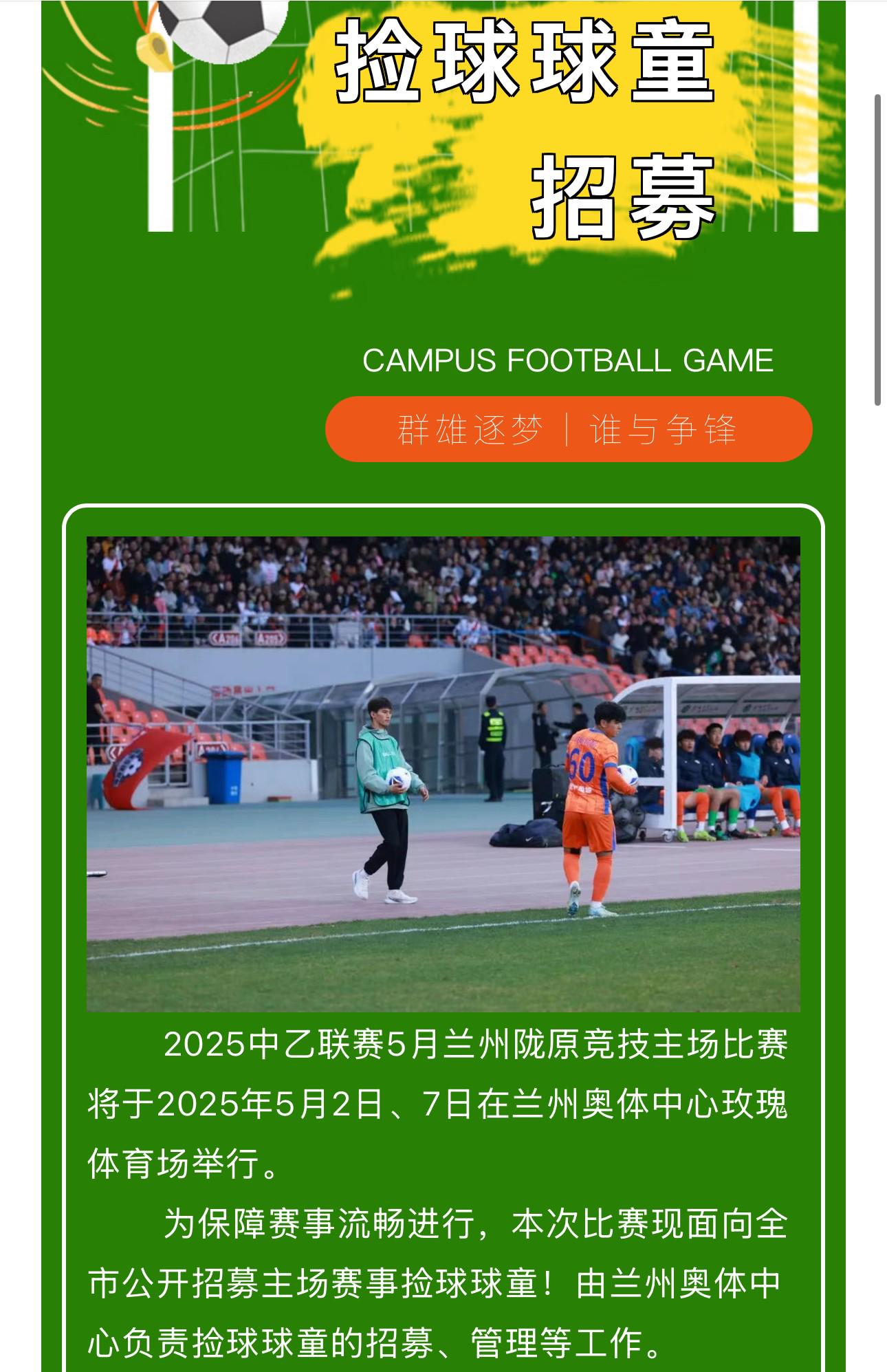 另外,兰州奥体中心官方公众号也发布了招募信息——2025中乙联赛5月兰州陇原竞技主场比赛将于2025年5月2日、7日在兰州奥体中心玫瑰体育场举行。为保障赛事流畅进行,本次比赛现面向全市公开招募主场赛事捡球球童!由兰州奥体中心负责捡球球童的招募、管理等工作。