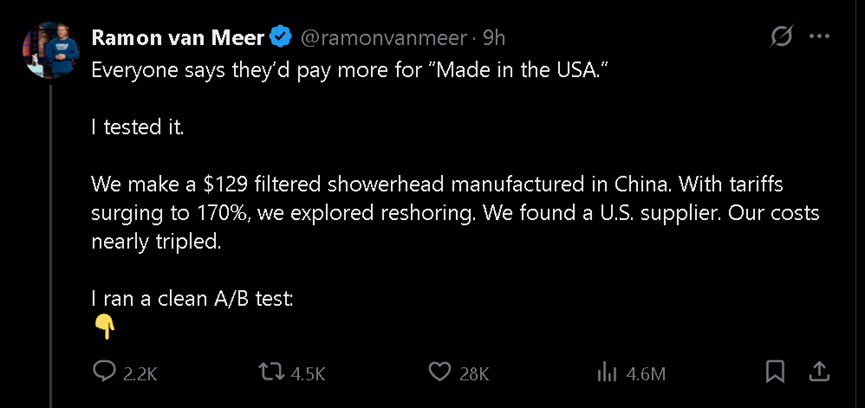 该公司老板因此发帖感叹说,即便他们想把制造业带回美国,美国的消费者也不愿意给美国制造买单了,因为消费者并不愿意承担产品在美国制造时的额外成本。而且,该老板表示,面对这种困境的企业并不只有他们一家。