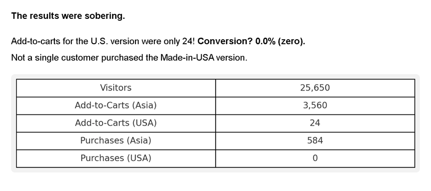 值得注意的是,该公司的官网还给出了一个细节,即最初他们在得到没有人下单“美国制造”的结果后,一度以为是数据搞错了,又反复进行了多次测试,但每一次的结果都是一样的:美国制造,无人买单。