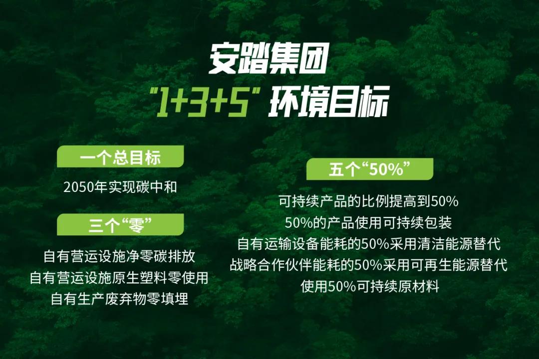 早在2021年,安踏就将可持续发展和ESG纳入公司未来十年的发展战略中,制定“1+3+5”的可持续战略目标,计划2030年前将材料、产品、包装、运输、核心供应链五个环节的可持续占比都提升到50%,全集团2050年实现碳中和。