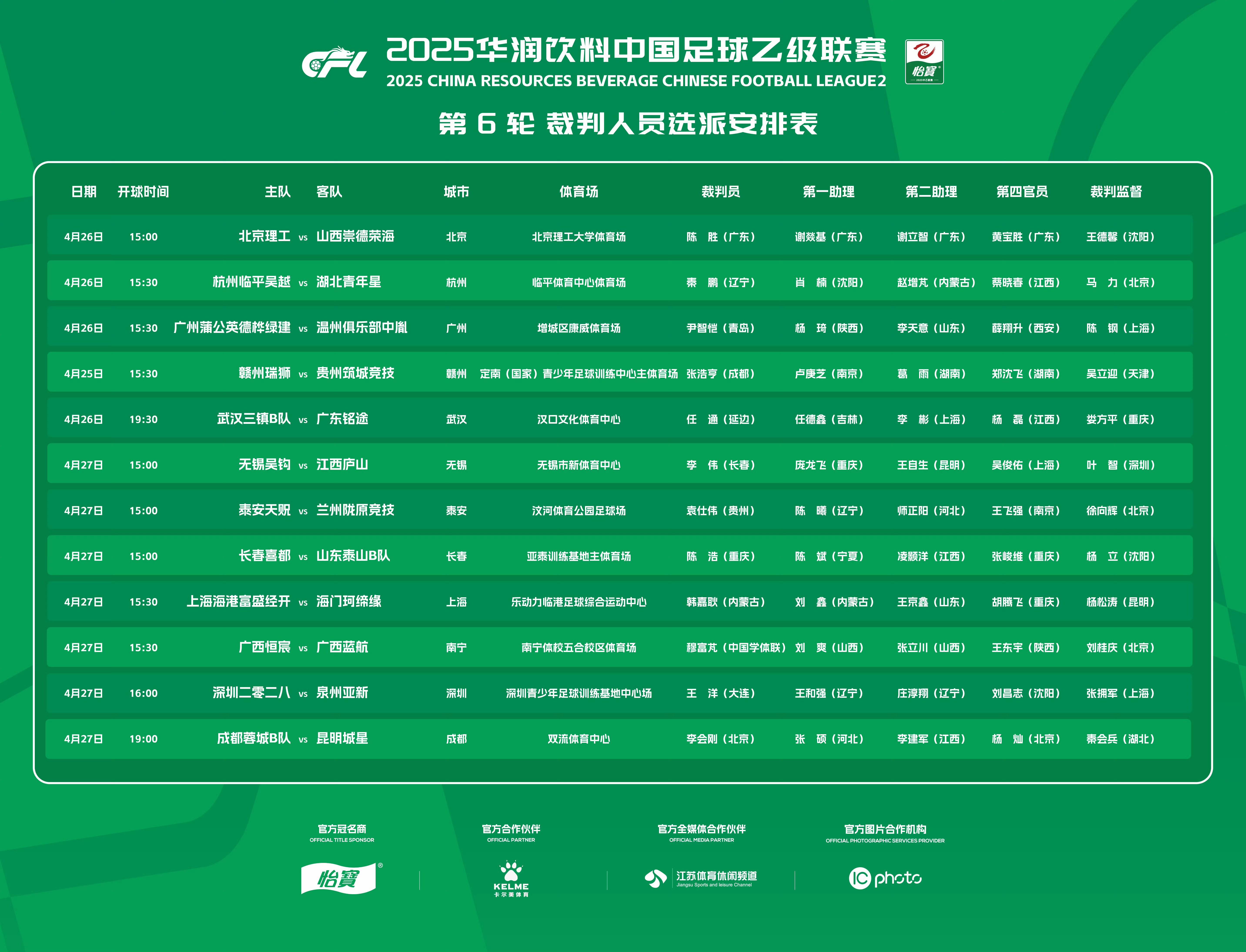 北京时间4月25日,中乙第6轮裁判名单公布,穆富芃执法广西恒宸vs广西蓝航。