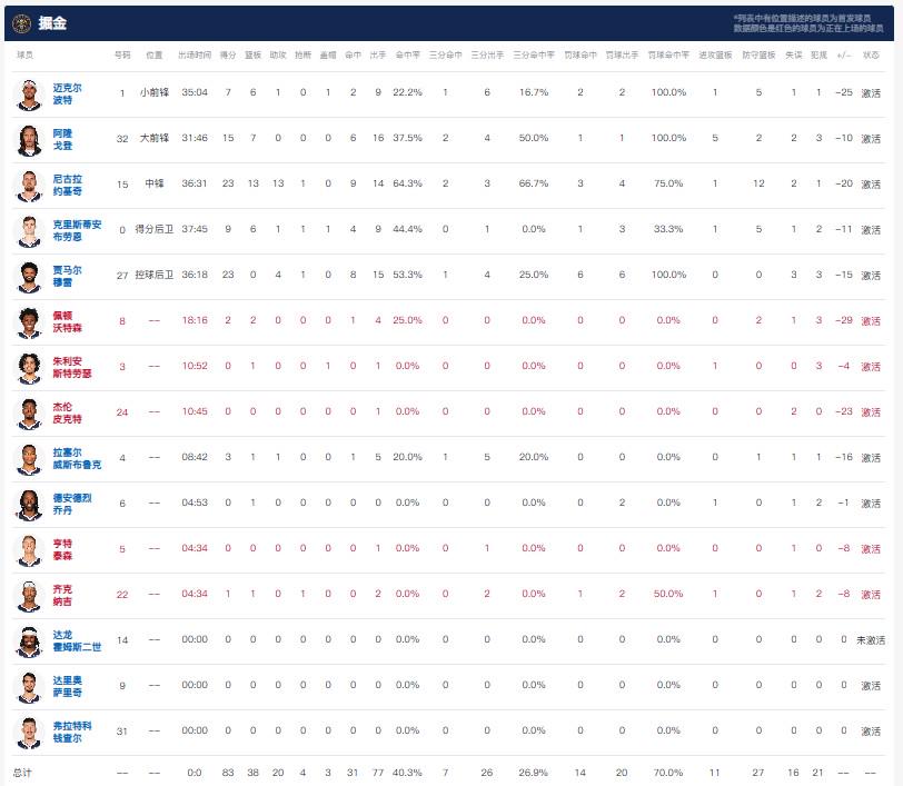 丹佛掘金贾马尔-穆雷23分4助1断,约基奇23分13板13助1断,戈登15分7板。