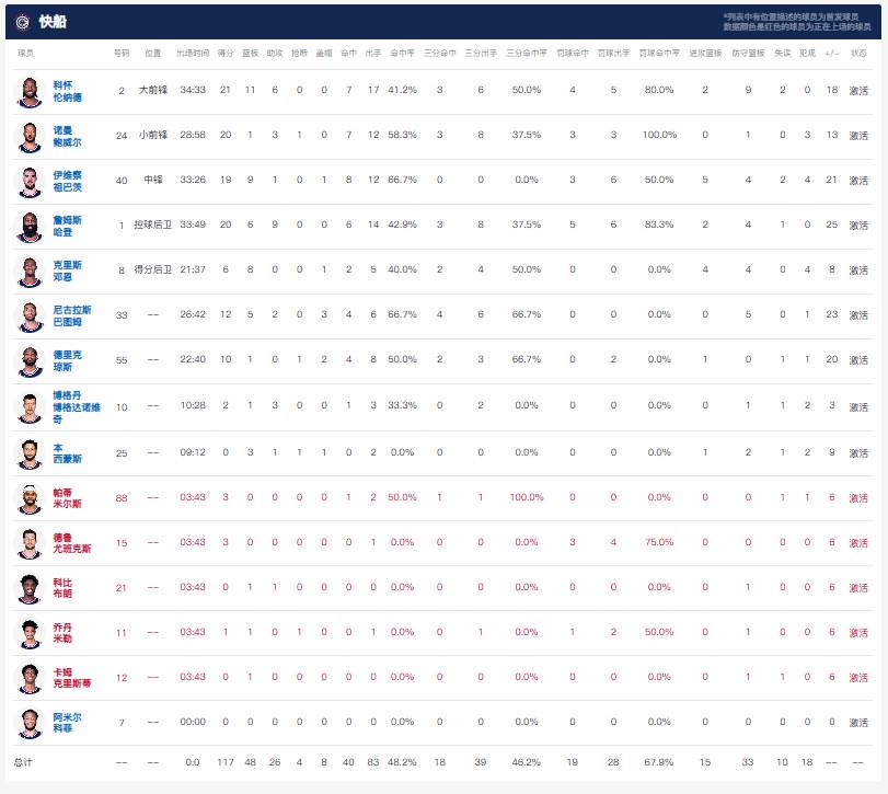 洛杉矶快船莱昂纳德21分11板6助,哈登20分6板9助,诺曼-鲍威尔20分1板3助1断;