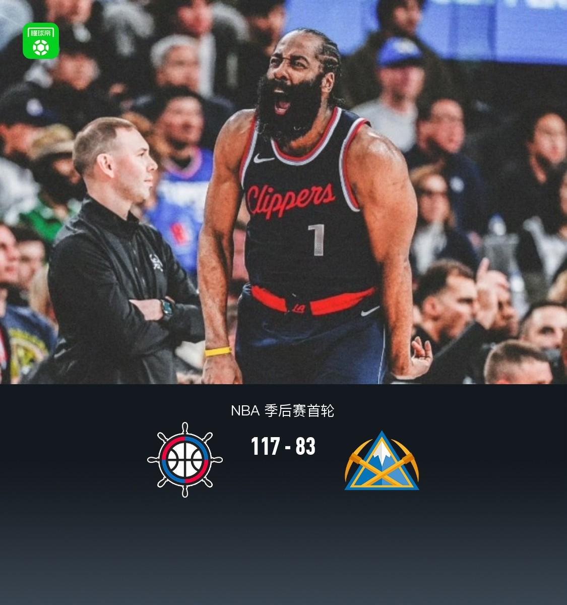 北京时间4月25日,NBA季后赛首轮G3快船主场迎战掘金。开场掘金依靠穆雷、戈登火热三分手感取得7分领先,节末快船哈登领衔一波16-2首节结束反超7分,次节快船延续势头轰出30-19,半场结束快船65-47掘金,下半场掘金反扑无力,快船牢牢维持20分上下领先,节末练兵时间快船替补进步拉大分差,最终快船117-83大胜掘金,大比分2-1领先。