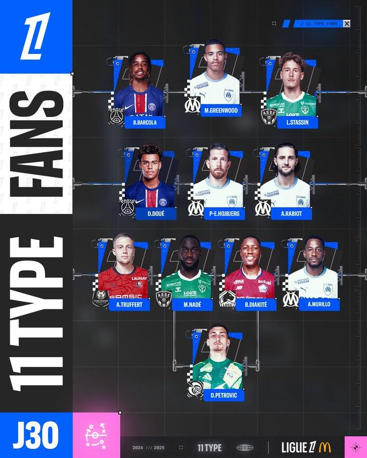 北京时间4月25日,法甲官方发布了联赛第30轮最佳阵容,格林伍德领衔马赛4人,巴黎2人入选。