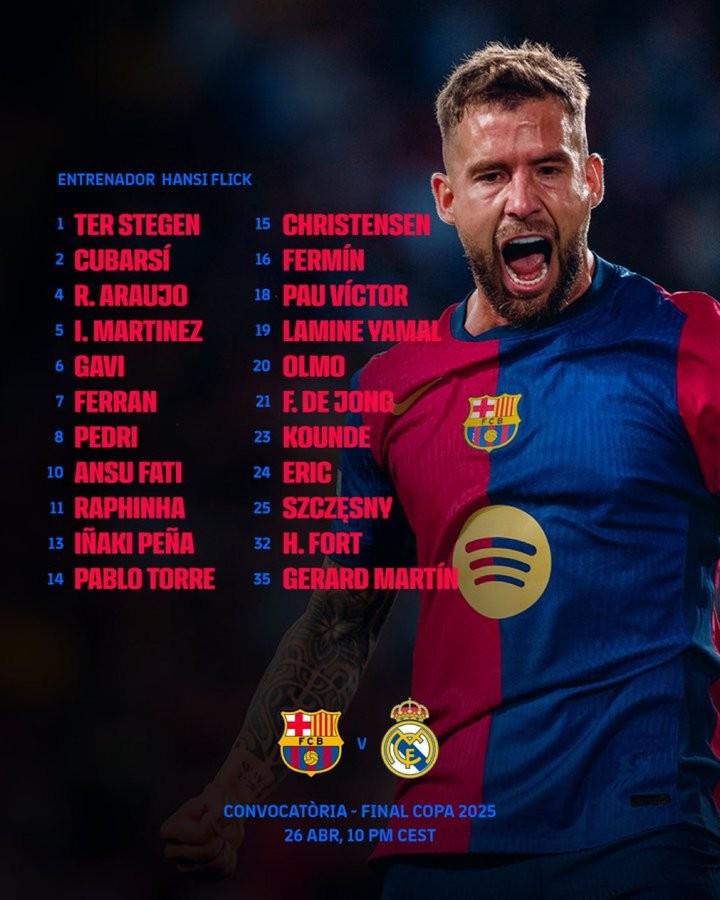 北京时间4月25日,巴萨官方公布西班牙国王杯决赛对阵皇马的大名单,莱万、巴尔德伤缺,特尔施特根复出。