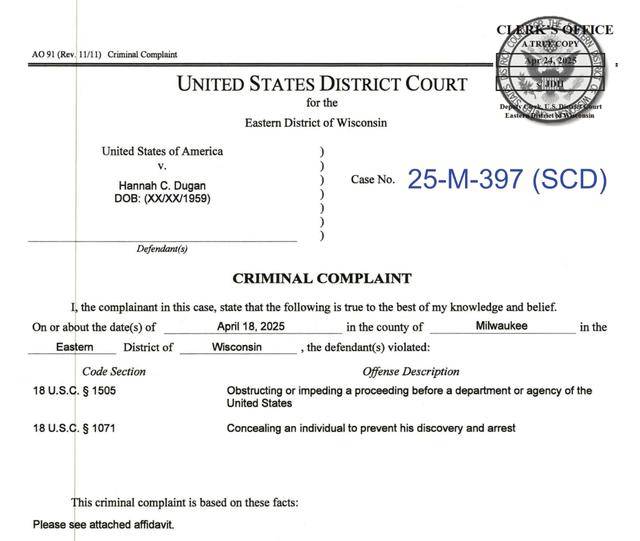 起诉文件显示,被捕的法官是密尔沃基县巡回法院法官汉娜·杜根。