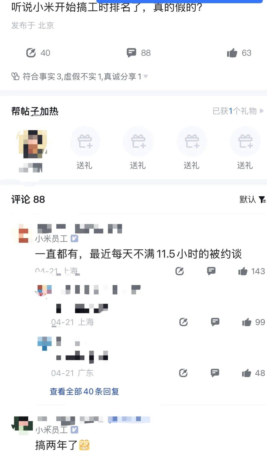 近日,“小米开始查工时”一事在各大社交平台引起热议,“小米被曝要求员工日均工时不低于11.5”的话题随后登上热搜。多位标签为“小米员工”的用户在职场社区“脉脉”上表示,小米已经执行了近两年的“查工时”,近期工时不满11.5小时的员工将被约谈。