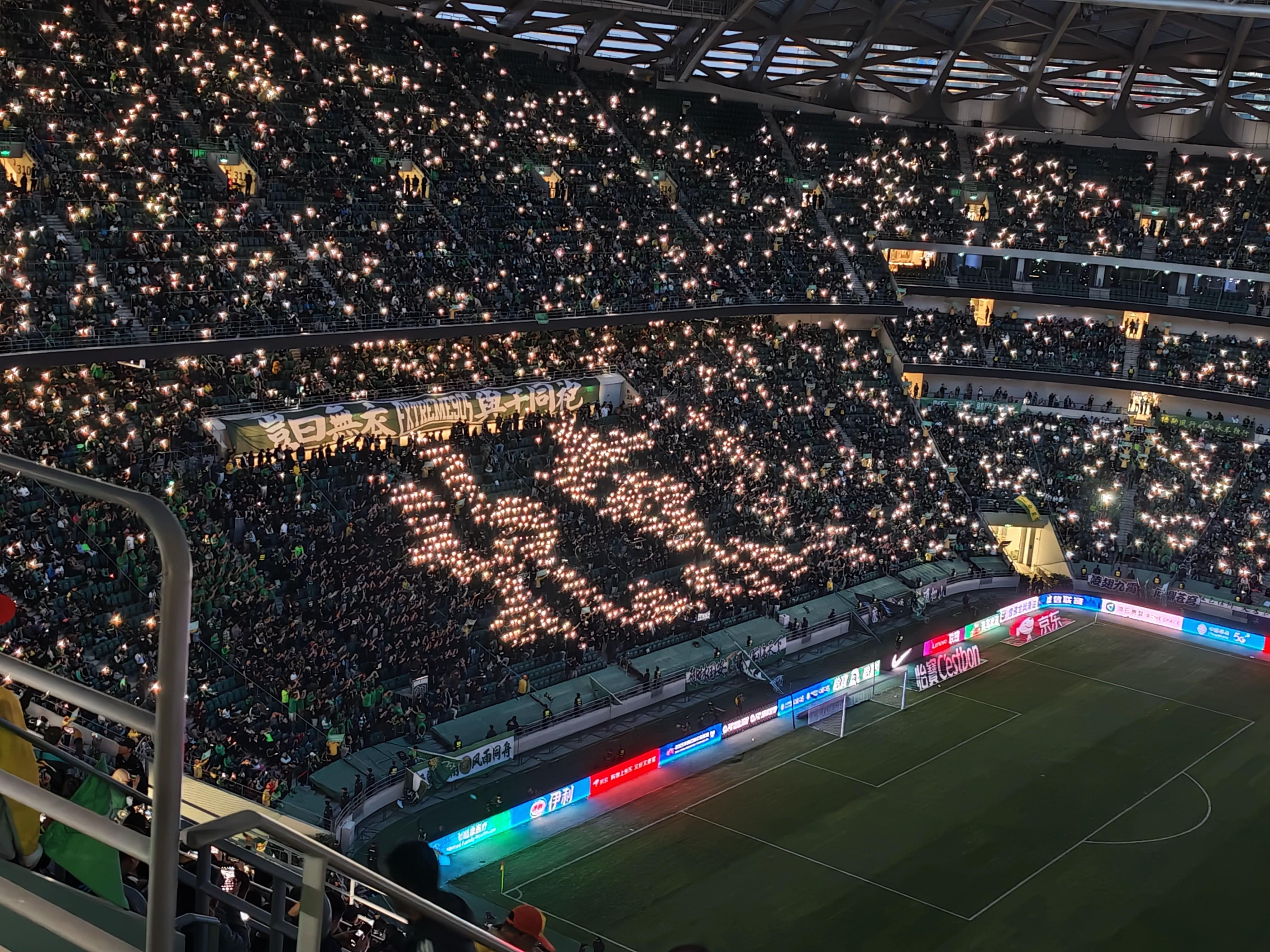 北京时间4月25日19点35分,北京国安于主场对阵河南。赛前,国安球迷在看台上用手电筒摆出“北京”二字,为球队助威。