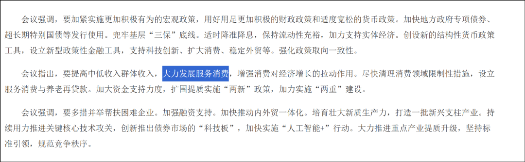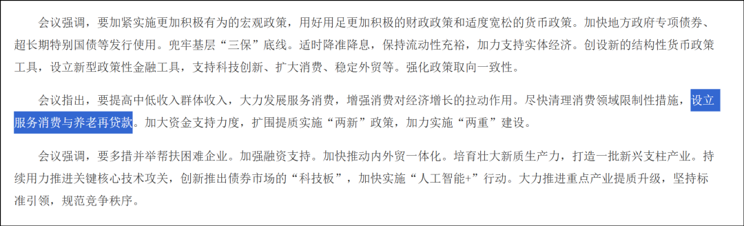 包括这次政治局会议里也提到“设立服务消费与养老再贷款”