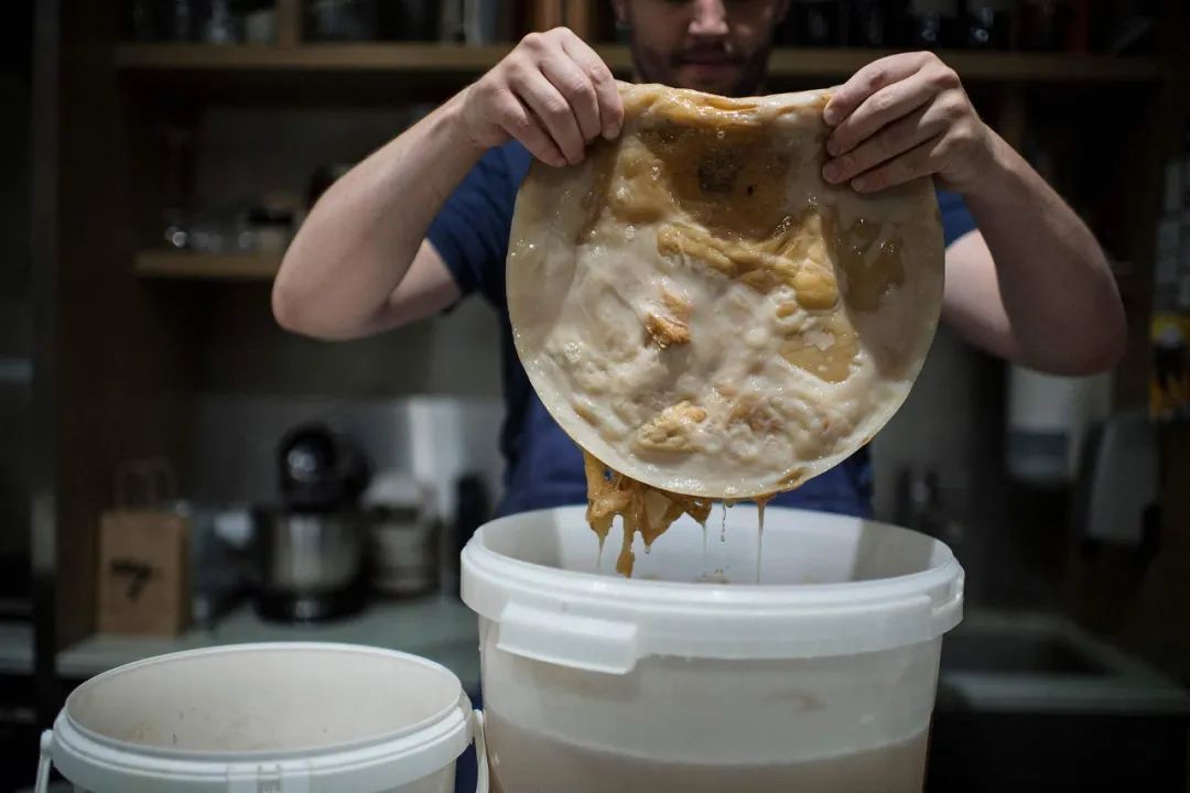 这些泛着气泡的液体,表面都顶着一片厚密的白色菌膜,形状宛如猪板油或魔芋豆腐。谭凯鹏告诉《新周刊》,这正是康普茶的秘密所在。