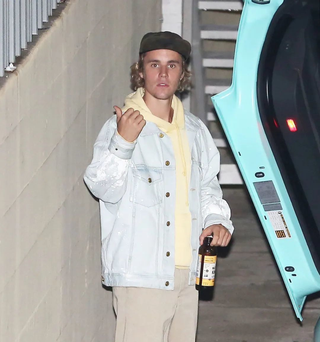 贾斯汀·比伯手持一瓶康普茶。(图/视觉中国)