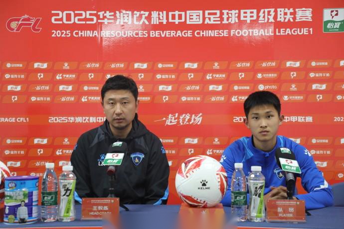 4月25日晚上,中甲第6轮南京城市vs重庆铜梁龙赛前新闻发布会,南京城市主教练刘智宇携队员余梦辉出席。