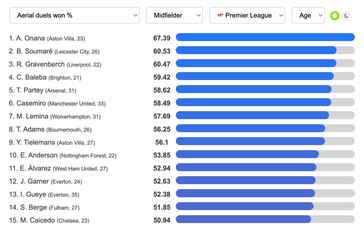根据数据网站DataMB的统计,阿斯顿维拉中场阿马杜-奥纳纳在英超中场球员中拥有最高的空中争顶成功率。