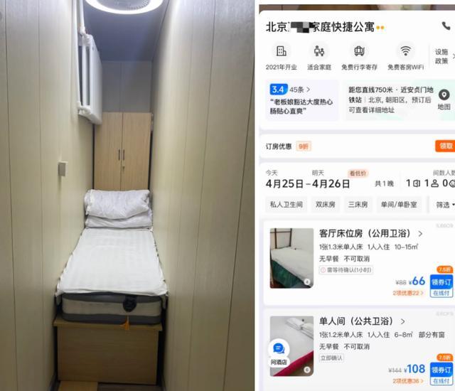 4月24日,一位网友在社交平台发帖称,其在北京通过某订房平台以95元/晚预订了一家快捷公寓单人间,实际入住时却发现房间狭窄逼仄,面积不足5平方米,床铺紧贴墙面,两侧几无空隙。该帖引发广泛关注,有网友称之为“胶囊房”“杂物间改造版”,也有人质疑是否符合最基本的居住和消防标准。