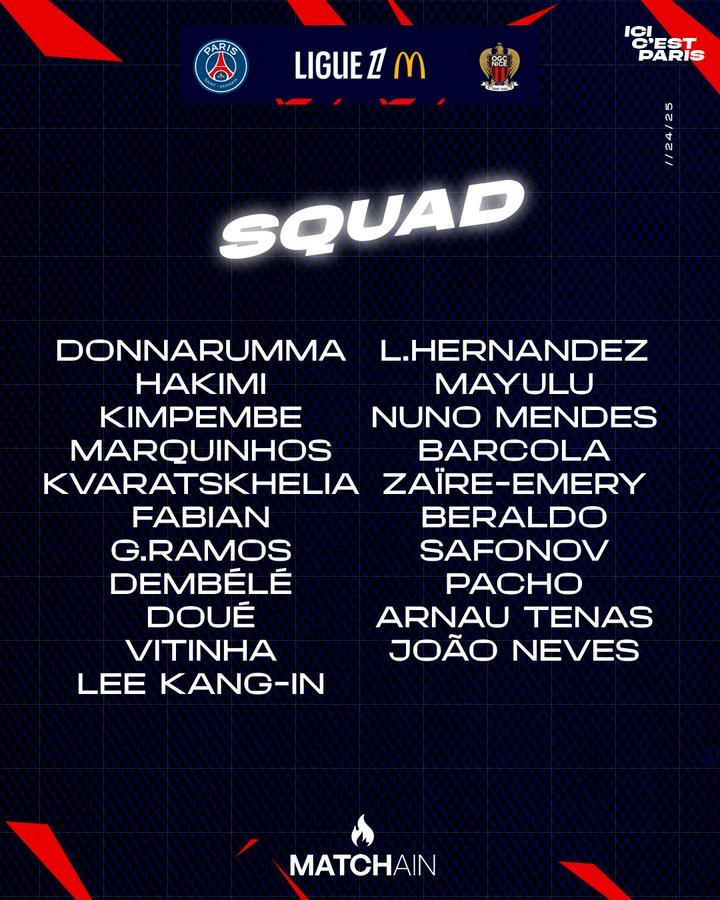 北京时间4月25日,巴黎官方公布联赛第31轮主场战尼斯大名单,登贝莱领衔,阿什拉夫回归。