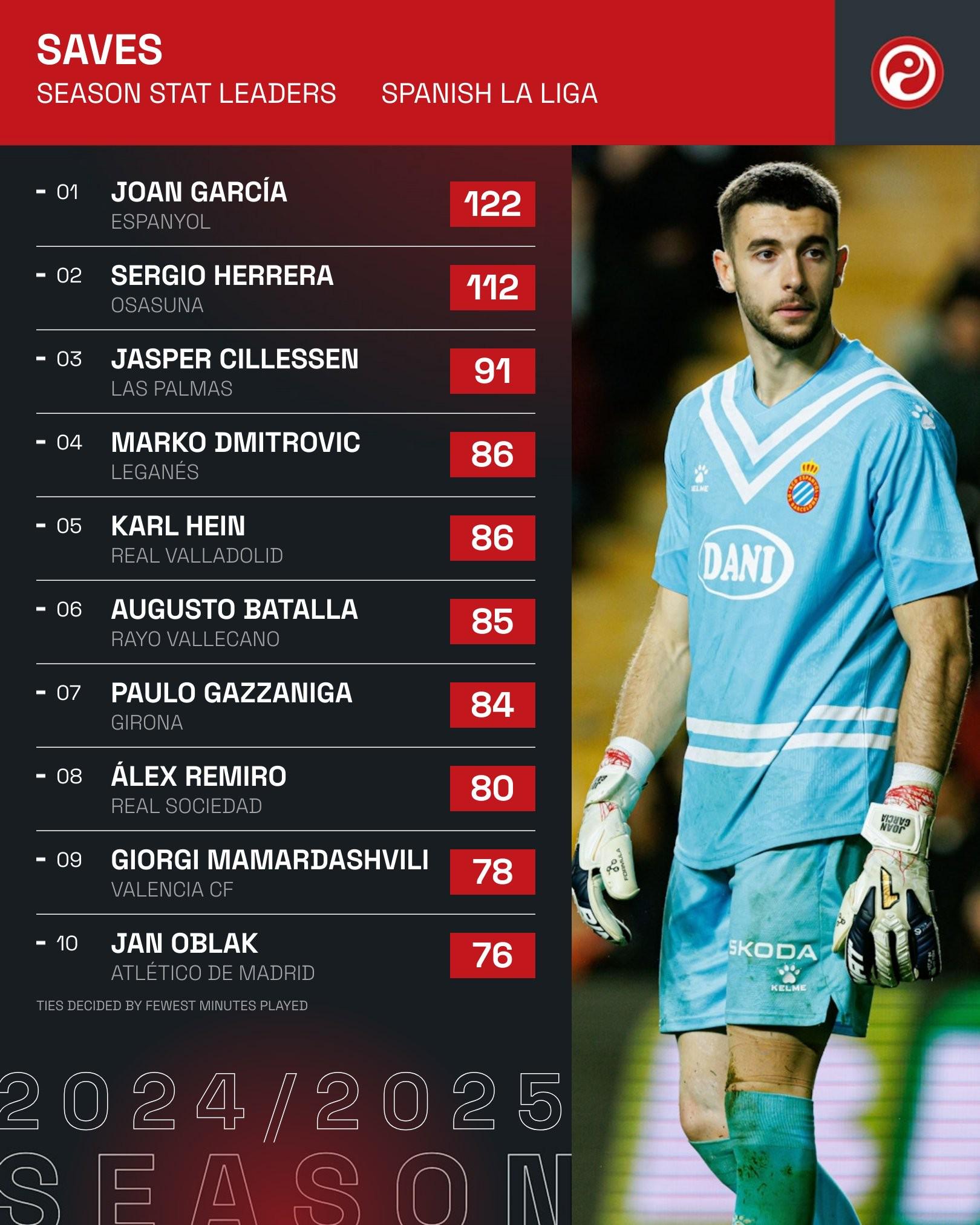 2024/25赛季西甲联赛门将扑救次数排行榜(截至4月25日)