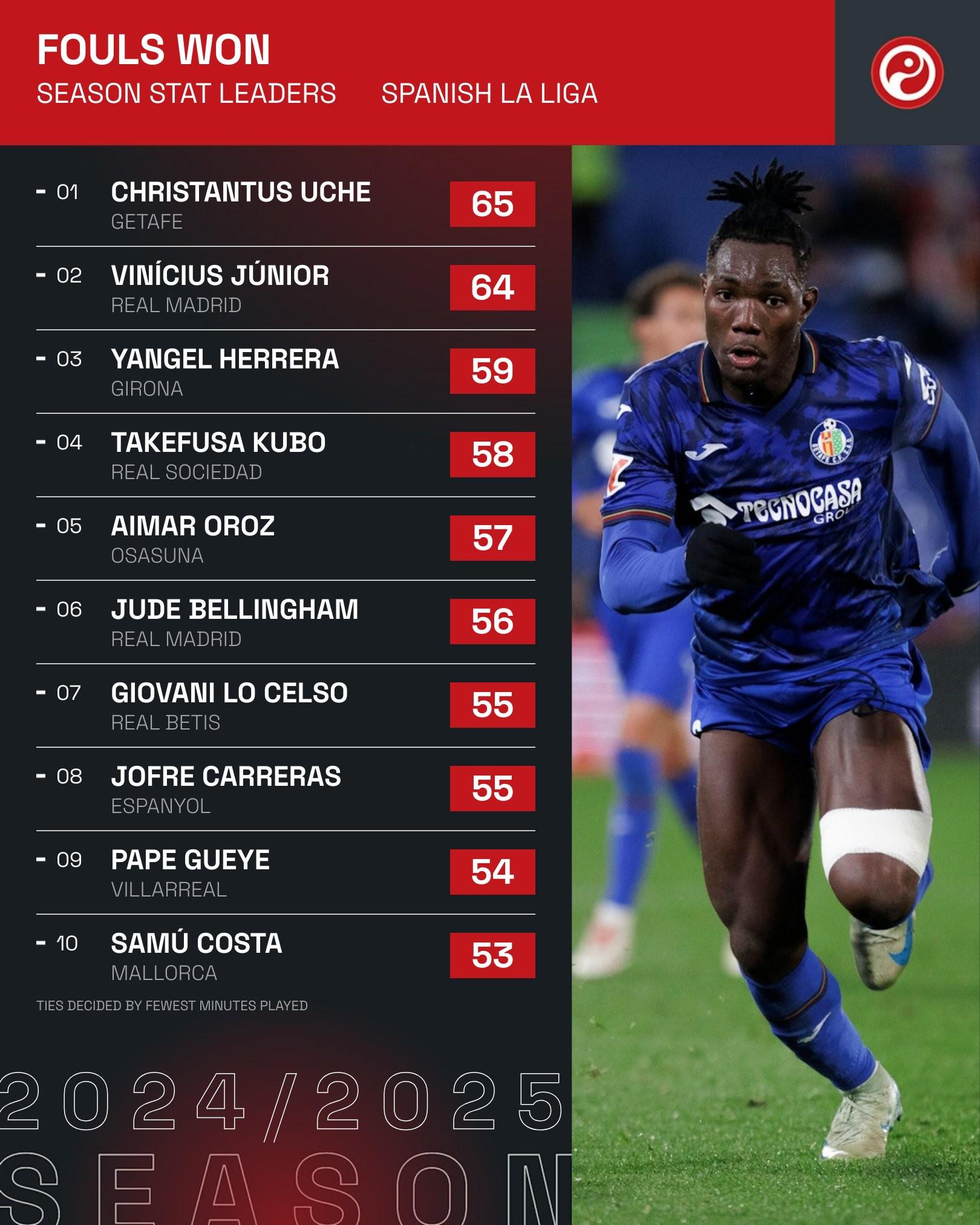 据统计,克里桑图斯-乌切、维尼修斯和扬赫尔-埃雷拉是本赛季西甲联赛截至目前被侵犯次数最多的三名球员。