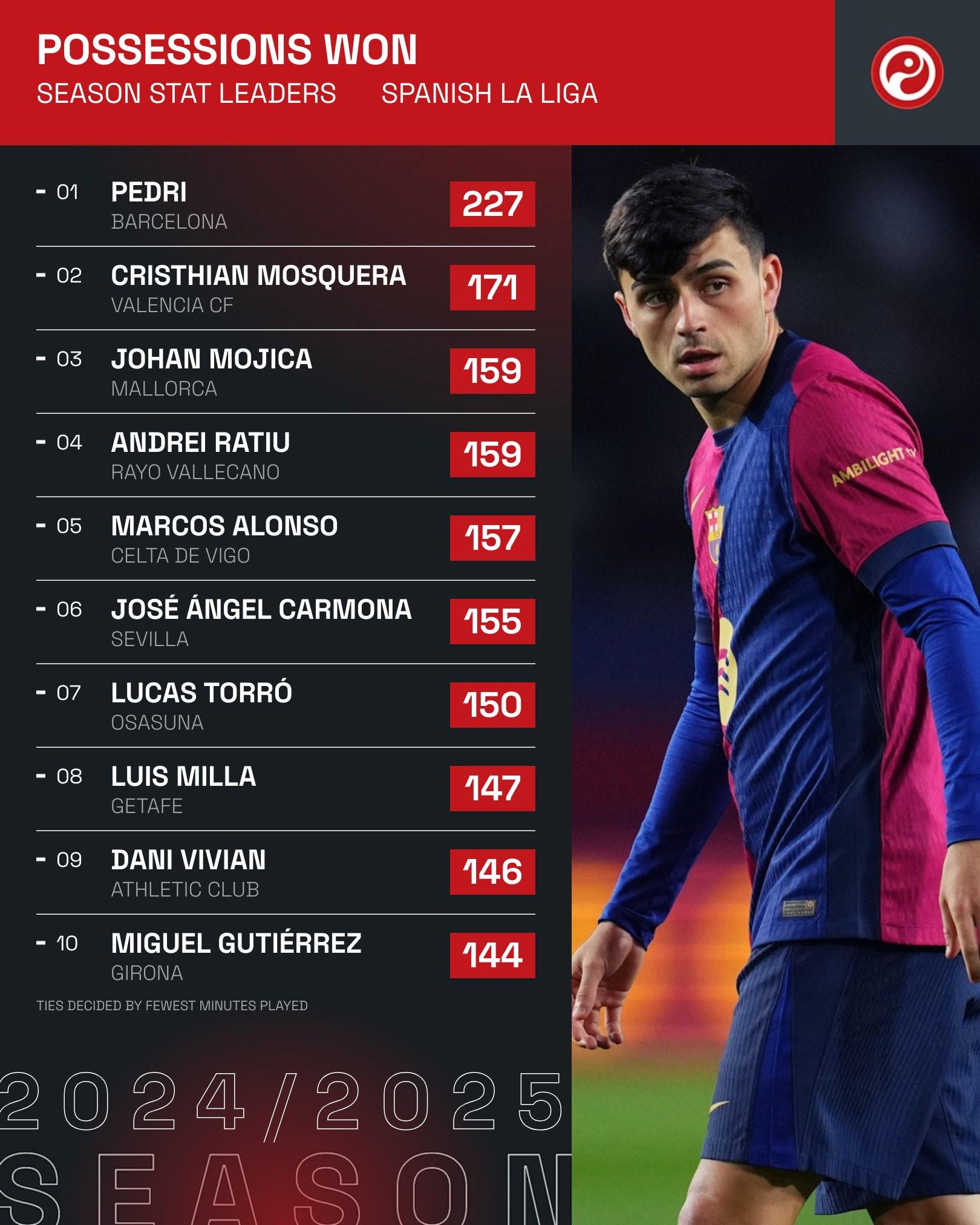 据统计,巴塞罗那中场佩德里是本赛季西甲联赛截至目前赢得球权次数最多的球员。