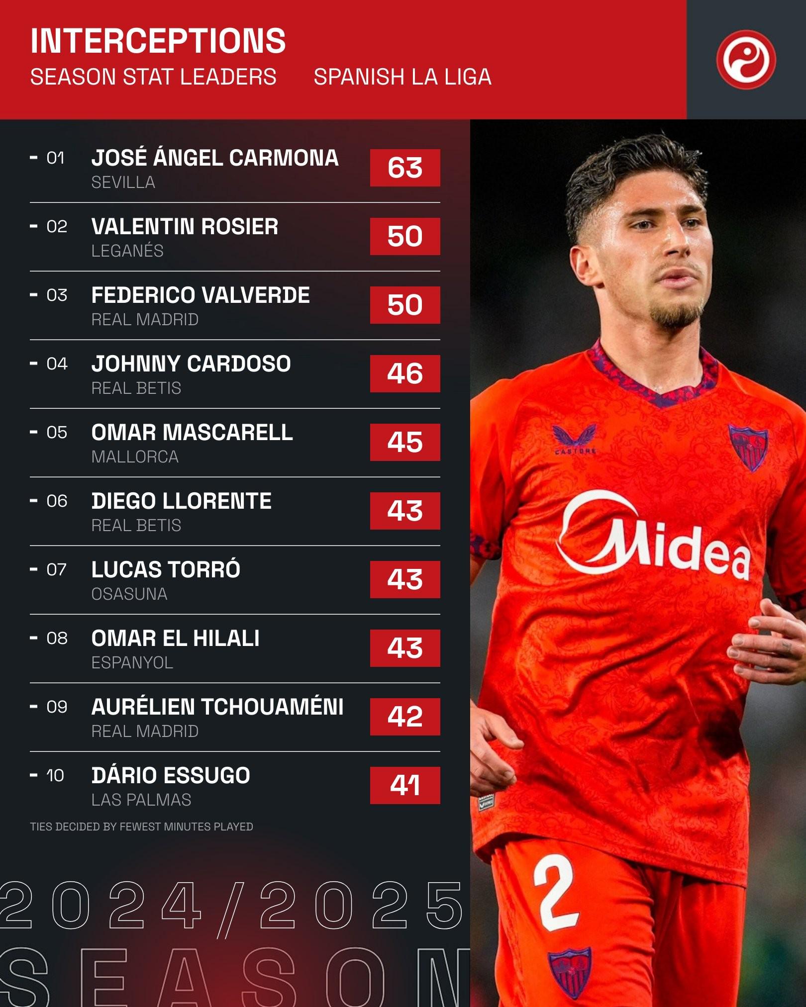据统计,何塞-安赫尔、罗齐尔和巴尔韦德是本赛季西甲联赛截至目前拦截次数最多的三名球员。