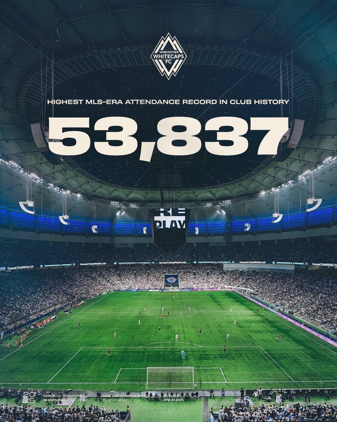 北京时间4月25日,美冠杯半决赛首回合,迈阿密国际客场0-2不敌温哥华白浪,据统计,本场比赛共有53837名现场观众。