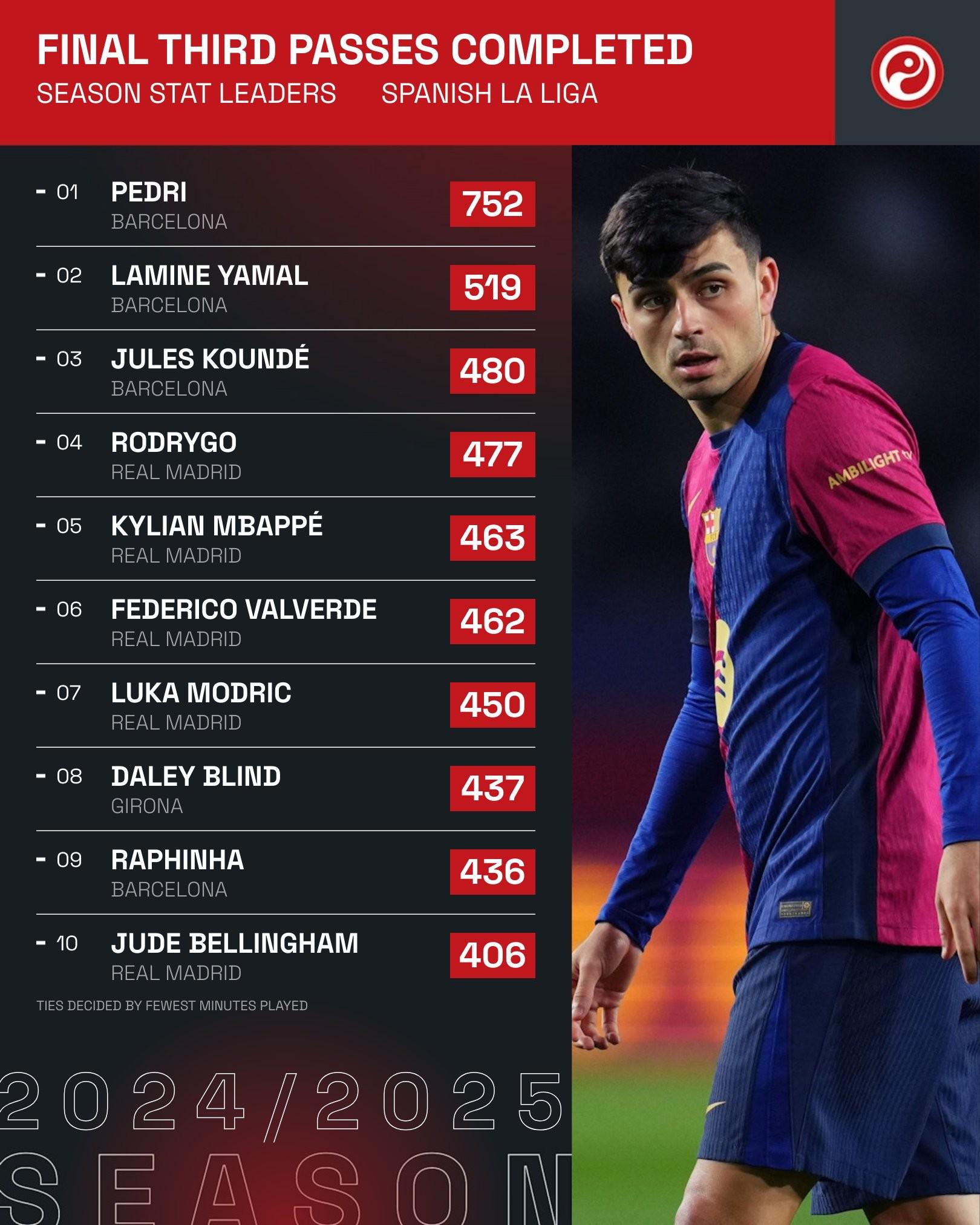 据统计,佩德里、亚马尔和孔德这三名巴塞罗那队友是本赛季西甲联赛截至目前传球进入进攻三区次数最多的三名球员。