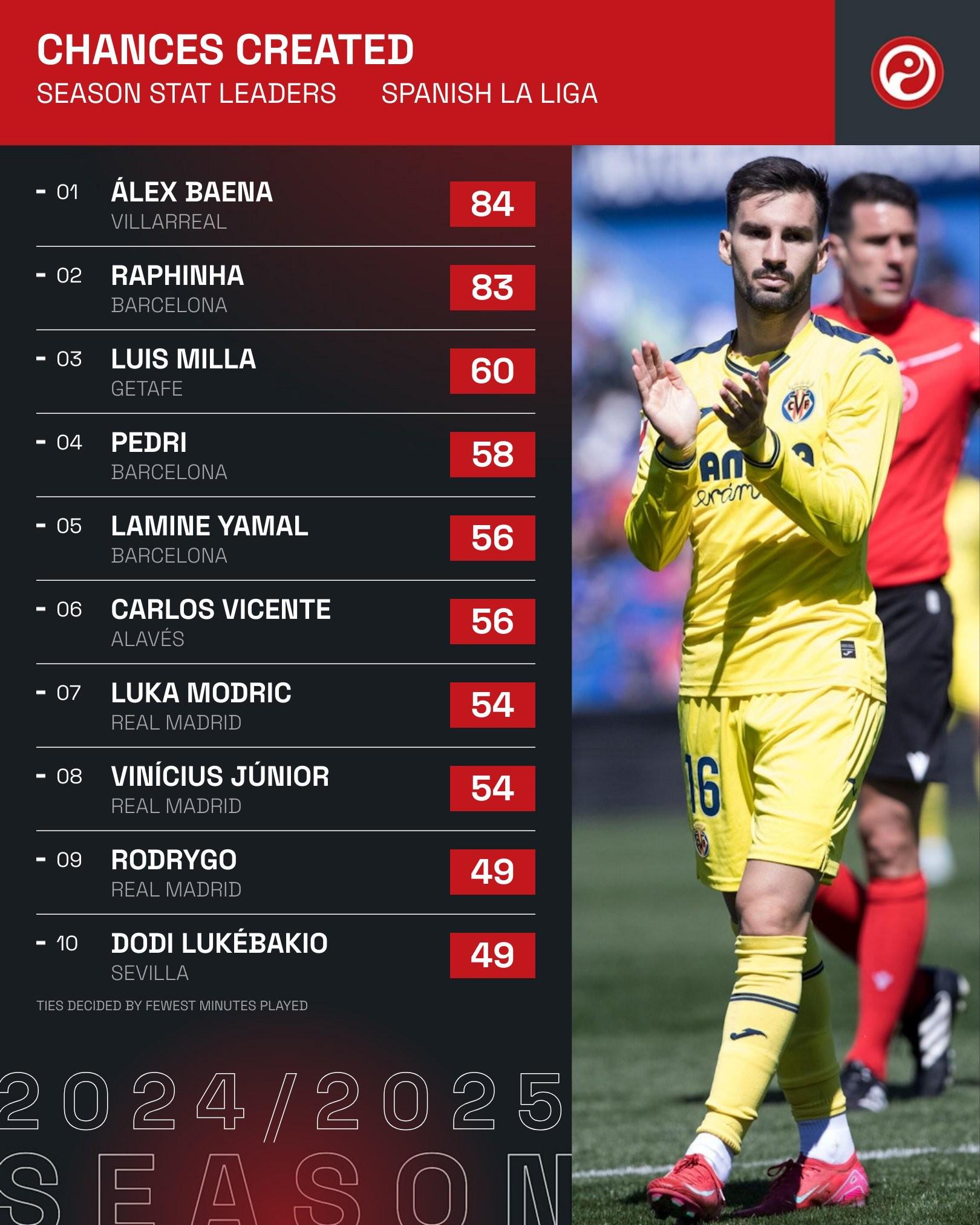 据统计,巴埃纳、拉菲尼亚和米利亚是本赛季西甲联赛截至目前送出关键传球次数最多的三名球员。