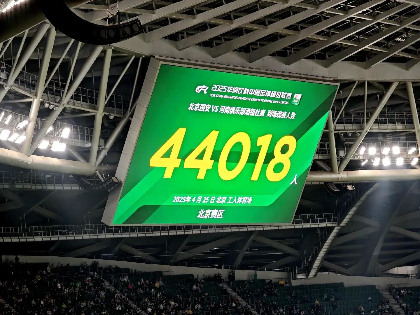 4月25日,周五晚19:35,北京国安vs河南队的比赛在北京工人体育场进行,据现场播报,一共有44018人入场观赛。这是北京国安本赛季中超的第4场主场比赛。
