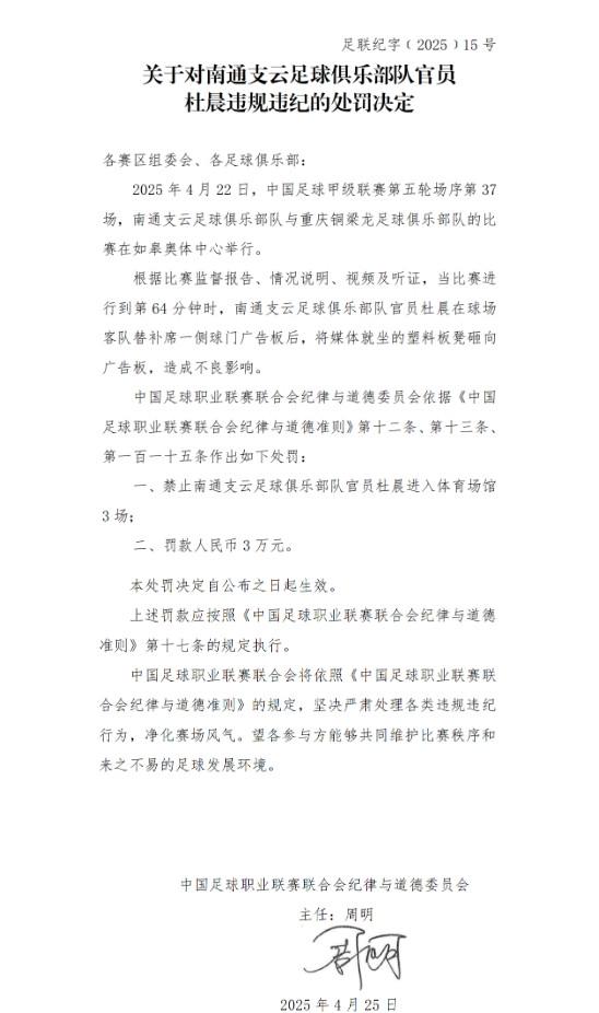 北京时间4月25日,中足联官方公布了对南通支云官员杜晨的处罚决定,他因将媒体就坐的塑料板凳砸向广告板,造成不良影响,被禁赛3场并罚款3万元。